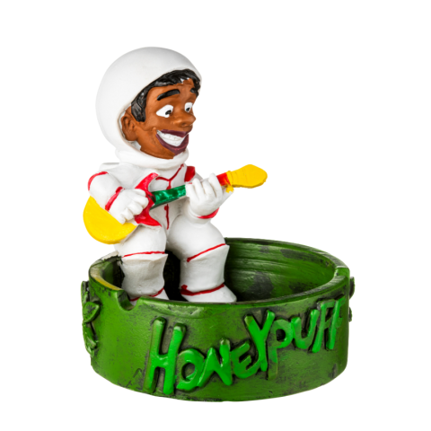 Ez a kerámiából készült hamutartó tökéletes alakot formáz egy ülő Rasta ember alakjában, aki űrhajós ruhát visel és éppen gitáron játszik. A hamutál zöld színű, amelyet egy 'HoneyPuff' felirat és cannabis levél díszít. A hamutartó azonnal szemet szúr szokatlan, vidám kialakításával. Dekoratív megjelenése miatt a lakás dísze lehet. Jó minőségű hamutál, ami akár ajándéknak is tökéletes választás.