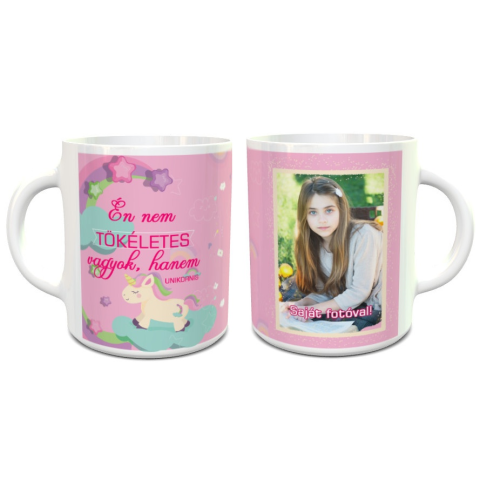 Fényképes bögre lányoknak, unikornis vagyok. Egy igazi csajos rózsaszín bögre, nem tökéletes vagyok, hanem unikornis felirattal. Válaszd szülinapra vagy névnapra és kérd az ünnepelt fotójával vagy kedvenc közös képetekkel. Egyedi nyomtatású bögréink ki