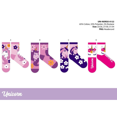 Unikornis gyerek pamut normál zokni - 4 pár/csomag - 27-30 Munkanapokon 24-48 órán belül feladjuk a rendelést. Anyagösszetétel: 65% pamut, 33% poliészter, 2% elasztán