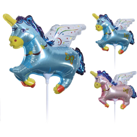 Unikornis formájú felfújható fólia léggömb, léggömb magassága 32 cm x26 cm, rózsaszín és kék színben vegyesen, a felfújó cső és a felakasztásra szolgáló zsineg a termék tartozéka.