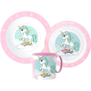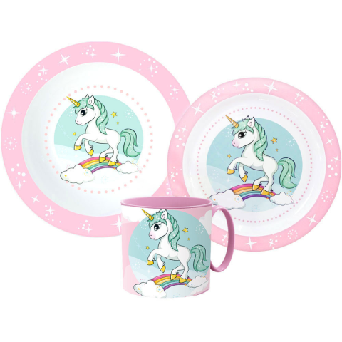 Unicorn, Unikornis Range Étkészlet, micro műanyag szett-BPA Mentes-Származási ország: Spanyolország-A termék környezetbarát, újrahasznosítható anyagból készült a Föld védelmében.Csomagolás nélkül!A készlet tartalma:1 db mélytálka (Mikrózható műanyag)1 db lapostányér (Mikrózható műanyag)1 db Micro bögre 265 ml (Mikrózható műanyag)A termék anyaga: műanyag.