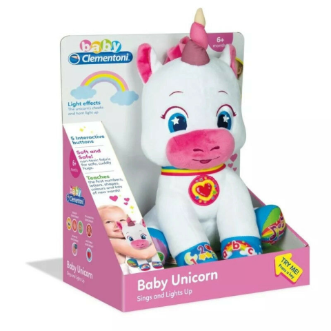 Unikornis interaktív plüss játék Clementoni Mérete: 33x26x18 cm - nagyon puha - 5 db interaktív gomb - magyar, cseh, szlovák nyelven énekel és zenél - a játék szarva és pofija világít - 6 hónapos kortól ajánlott