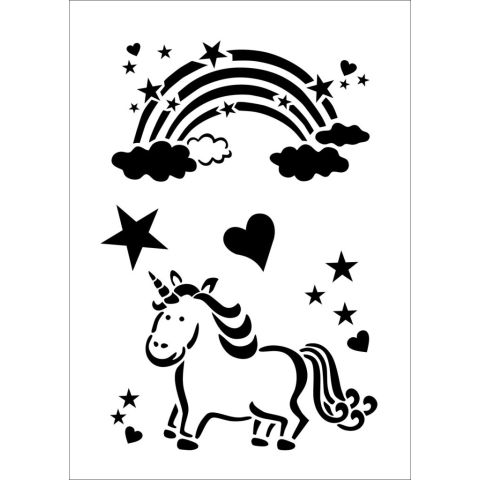 Többször felhasználható műamyag festő sablon - stencil, Unikornis/egyszarvú minta. Jellemzói: Unikornis minta A/4-es sablon kreatív felhasználásra dekoráció készítéshez pl. gyerekszobába falra, bútorra,hósprayvel ablakra, textilfestékkel textilekre, akr