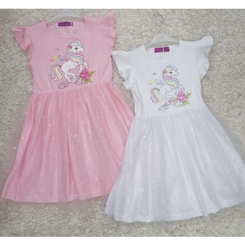 Rövid ujjú kislány egész ruha melynek felső részén unikornis minta található, a szoknya rész pedig tüll apró szivecskékkel díszítve. Könnyű és kényelmes viselet. Teljes hossz: 66 cm Szélesség: 33 cm Anyaga: 95 % pamut, 5 % spandex
