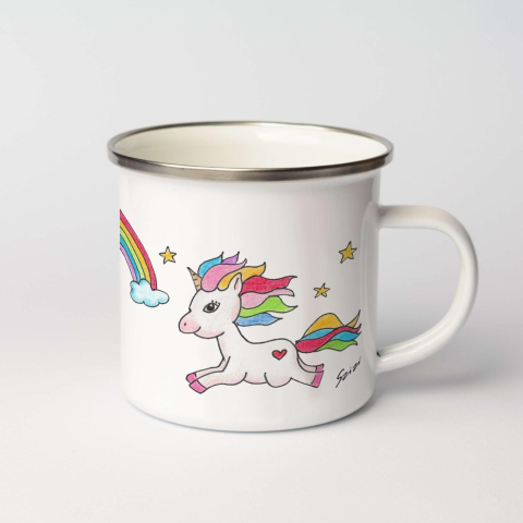 Zománcozott fém bögre unikornis mintával, amely felirattal névre szólóvá is tehető.A fém anyag miatt mikrohullámú sütőbe nem tehető be. Mosogatógépben tisztítható.