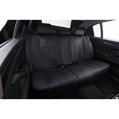 1 kép Univerzális autósüléshuzat-garnitúra, fekete ecobőr, piros varrással, elöl-hátul