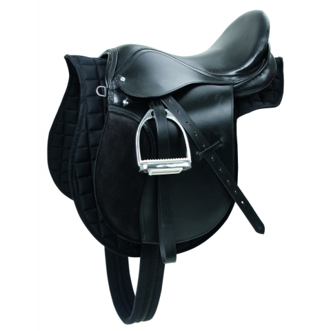 Fekete, univerzális komplett nyereg 17,5 méretben. Tökéletes választás kezdő és haladó lovasok számára. Magas minőségű bőr anyagból készült, szabott nyeregalátéttel és kiegészítőkkel. Fedezze fel új, univerzális komplett nyergünket, amely tökéletes vál