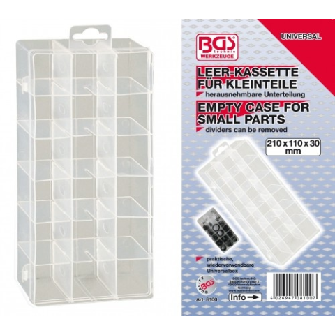 Praktikus tároló eszköz apró alkatrészekhez;Kivehető elválasztó falak;210x110x30 mm-es méret.Élettartam anyag- és törésgarancia!