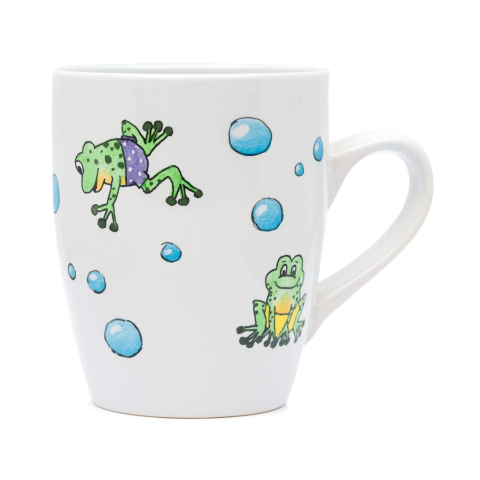 Úszónadrágos békás bögreBögre úszónadrágos békás mintával. A bögre a mintával átellenes oldalon név felirattal személyessé tehető. Mosogatógépben tisztítható, mikrohullámú sütőbe betehető.