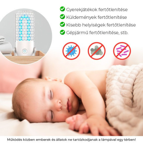 UV-99 Hordozható Fertőtlenítő Germicid UV lámpaAz UV-C fény segítségével vegyszermentesen fertőtlenítheti lakását, autóját, vagy személyes tárgyait. Szabaduljon meg a telefonján, kulcsain, iratain vagy maszkján található kórokozóktól egy egyszerű gombnyomással.Vegyszermentes fertőtlenítésEljut a mosószerrel vagy spray-vel nem elérhető helyekre isHordozható, akkumulátorról üzemeltethetőEgyszerű és biztonságos használatFertőtleníti, frissíti és megszaba