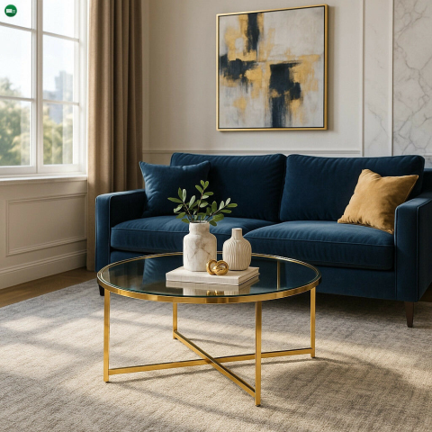 Üveg Dohányzóasztal Arany Vázzal. FLIP bútor árgrafikon