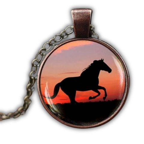 Üveges lovas nyaklánc, elegáns bronz színben, élethű motívummal. Tökéletes ajándék minden lovas számára, egyedi és stílusos kiegészít