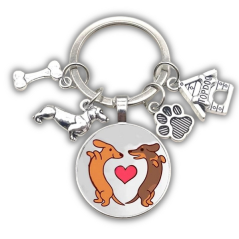 Egyedi üveges tacskó kulcstartó öt különböző medállal, tacskó rajongóknak tökéletes választás, stílusos és tartós kivitelben