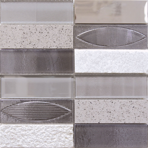 Üvegmozaik szürke színben mérete 30x30 cm fényes / matt kivitelezésű felülettel. Téglalap alakú alapelem mérete 14,8x4,8 cm