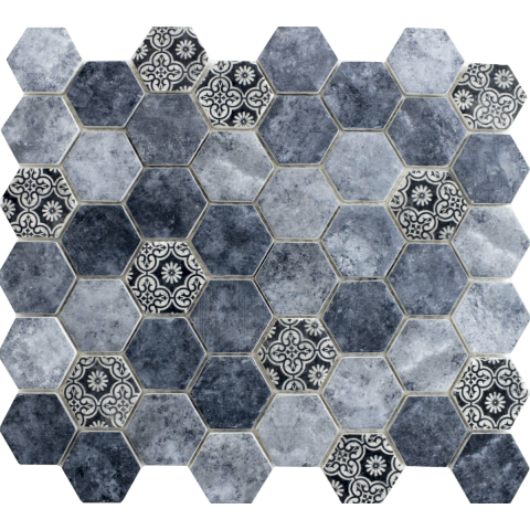 Üvegmozaik kék színben mérete 28x32,4 cm vastagsága 6 mm patchwork kivitelben matt felülettel. Hatszög alakú alapelem mérete 2,6x4,5 cm