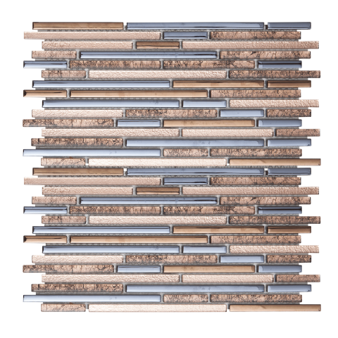 Barna üvegmozaik 30x30 cm méretű és 6 mm vastag fémes kivitelben, fényes felülettel. Különféle formájú alapelem 0,8x4,8-0,8x9,8-0,8x14,8 cm