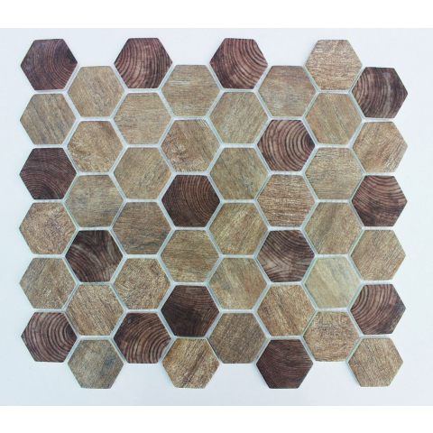 Üvegmozaik barna színben mérete 28x32,5 cm vastagsága 6 mm fautánzatban matt felülettel. Hatszög alakú alapelem mérete 2,6x4,5 cm