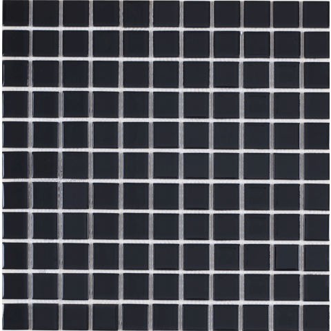 Üvegmozaik fekete színben mérete 30,5x30,5 cm vastagsága 4 mm fényes felülettel. Négyzet alakú alapelem mérete 2,5x2,5 cm