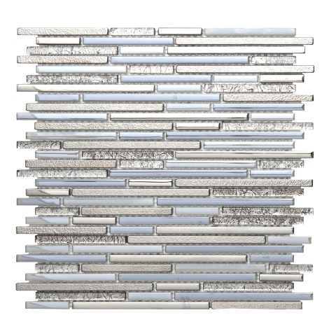 Üvegmozaik szürke színben mérete 30x30 cm vastagsága 6 mm fémes kivitelben fényes felülettel. Különböző alakú alapelemek mérete 0,8x4,8-0,8x9,8-0,8x14,8 cm