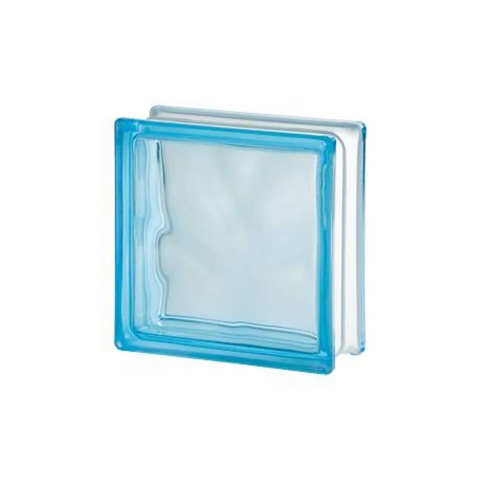 Üvegtégla WAVE színezett kék 190 mm x 190 mm x 80 mm. Belső és külső falak építéséhez, térelválasztóként vagy dizájnelemként is alkalmazható.