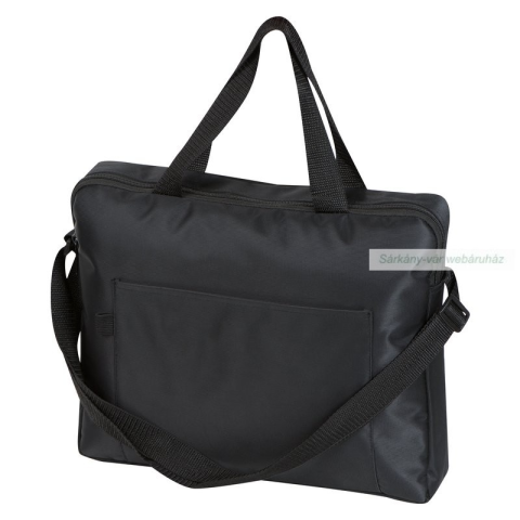 UTOLSÓ DARAB! Fekete poliészter laptoptáska,két hord szíjjal, állítható vállpánttal,első zsebbel és cipzárral. Emblémázását szitanyomással javasoljuk. Méret:35,5 × 10,5 × 29cm A dekoráció nem része az ajánlatnak. Rendelésre: 3-10 nap!