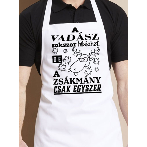 Vicces kötény vadásznak, a vadász sokszor hibázhat, de a zsákmány csak egyszer, a nagy igazság vadászok számára, melyet most egy kötényen is olvashatsz humoros szarvas mintával. Ajándékozd meg vele vadász ismerősödet, barátodat vagy családtagodat. Fekete