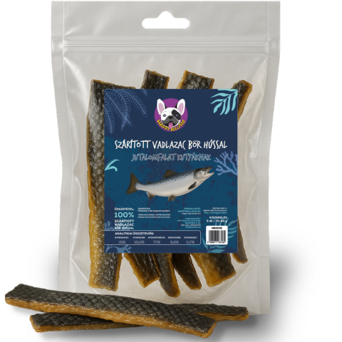 Nálunk, a Happy Bulldognál minden finomságot úgy készítünk, mintha a saját kutyáinknak szánnánk. Ez a szárított vadlazac bőr hússal nem tartalmaz semmi mást – kizárólag tiszta, természetes lazacot. Kíméletesen, alacsony hőmérsékleten szárítjuk, hogy megőrizzük benne mindazt, amit a természet adott: az értékes zsírsavakat, a természetes fehérjéket és az intenzív ízeket, amit a kutyák imá