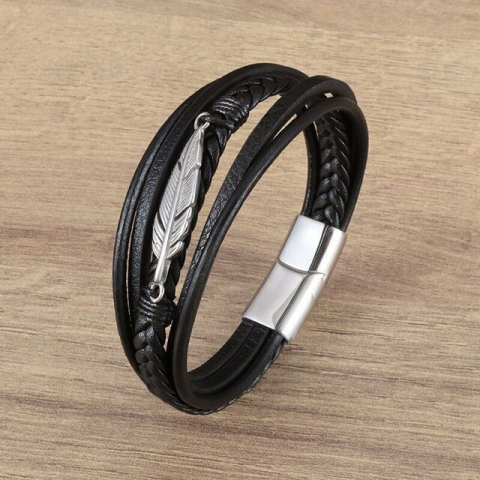 1 kép Vagány műbőr férfi karkötő, ezüst színű madártoll dísszel