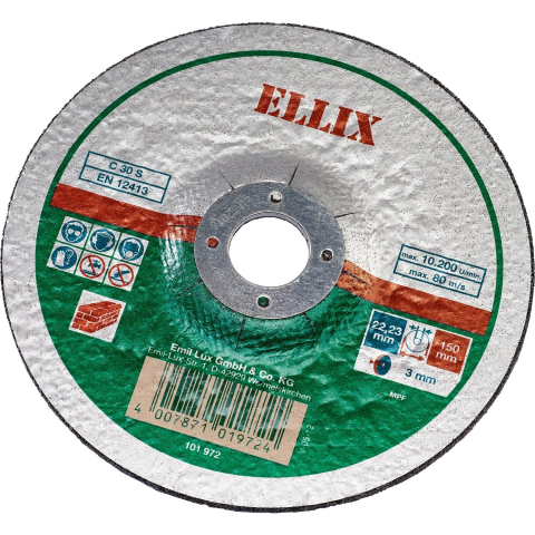 A ELLIX 150 mm átmérőjű gyémánt vágókorong közepes keménységű és kemény kő és építőanyag vágására alkalmas. 22,23 mm-es furatának köszönhetően sarokcsiszolóval használható. A vágókorong vastagsága 3 mm.
