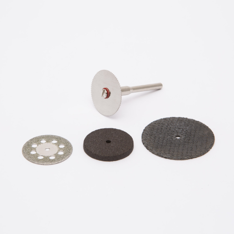 A szett tartalma: 1 db műgyantás korong 1 db vágókorong 1 db fémkorong 1 db gyémántkorong 1 db 3,1mm átmérőjű rögzítő tengely Max fordulat: 28000/perc A midi (10362) és a maxi (10363) panelfúrónkkal is kompatibilis termék.