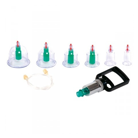 Hat darab különféle méretű vákuum poharat, egy kézi pumpát és vákuum csövet tartalmaz készlet. A négy legnagyobb pohárhoz egy-egy darab rugós középbetét is tartozik, melynek az ősi kínai gyógyászatban van fontos szerepe. A pohárkák szeleppel vannak el