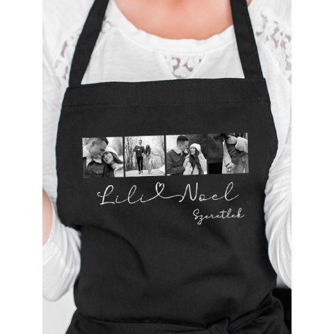 Valentin napi ajándék, 4 fényképes kötény. Szerelmes ajándék barátod, barátnőd születésnapjára, névnapjára, de akár házassági évfordulóra is tökéletes meglepetés. 4 darab saját fotóval, névvel és gyönyörű nyomattal, szeretlek felirattal készült termék bár