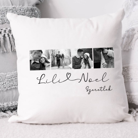 Valentin napi ajándék, 4 fényképes párna. Szerelmes ajándék barátod, barátnőd születésnapjára, névnapjára, de akár házassági évfordulóra is tökéletes meglepetés. 4 darab saját fotóval, névvel és gyönyörű nyomattal, szeretlek felirattal készült termék bárm