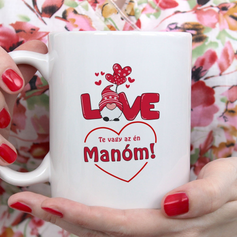 Szerelmes manós bögre, Valentin napi ajándék. Aranyos manóval, Te vagy az én manóm felirattal. Lepd meg párodat a szerelmesek napján egy romantikus ajándékkal. A bögrék anyaga kerámia vagy zománc. Mosogatógépben tiszíthatóak. Egyedi nyomtatású bög