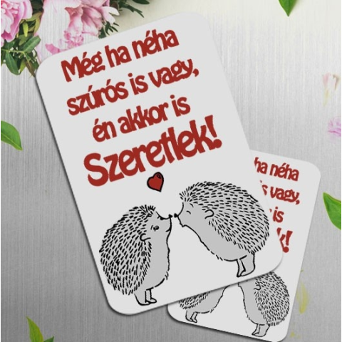 Szerelmes hűtőmágnes, ha néha szúrós is vagy. Még ha néha szúrós is vagy én akkor is szeretlek, vicces feliratos hűtőmágnes cuki sünikkel valentin napra, születésnapra szerelmednek. A hűtőmágnes anyaga 1 mm vastag mágnes lap, hátterének színe fehér (enyhé