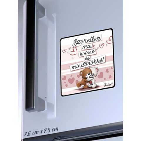 Valentin napi ajándék, Szeretlek ma, holnap és mindörökké hűtőmágnes. Anyaga: műanyag, hátoldalán mágnes csíkkal Mérete: 7,5 x 7,5 cm, 0,3 cm vastag
