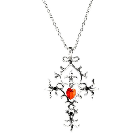 Elegáns gótikus kereszt nyaklánc rubin színű szívkővel, tökéletes választás Vámpírnaplók rajongóknak és gótikus stílus kedvelőinek