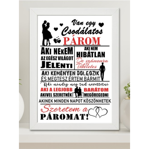 Van egy csodálatos párom falikép, ajándék évfordulóra nagy méretű falikép formájában. Az A3-as képkeret mérete 30x40 cm, színe fehér, falra akasztható. Ha Te is úgy gondolod, hogy van egy csodálatos párod akkor lepd meg Őt egy évfordulós ajándékkal ami ö