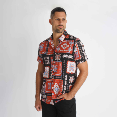 Regular Fit, piros alapon mintás ing, vékony lezser anyagból, gallérral és lekerekített alsó szegéllyel Modell: 185 cm/ 85 kg/ L-es méret