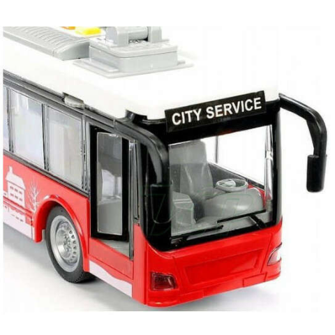 Szállítsd az utasokat trolibusszal! A MAN Városi troli 1:16 méretarányú piros színű trolibusz, amivel a városba szállíthatod az utasokatA MAN Városi troli egy tömegközlekedési eszköz, gombnyomásra négy különböző hangot ad és az
