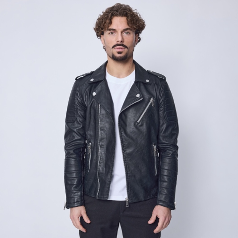Slim fit fekete színű műbőr motorosdzseki ferde cipzárral , mellzsebbel és oldalzsebekkel, cipzáros kézelővel és bordázott részletekkel. Modell: 185 cm/ 85 kg/ L-es méret