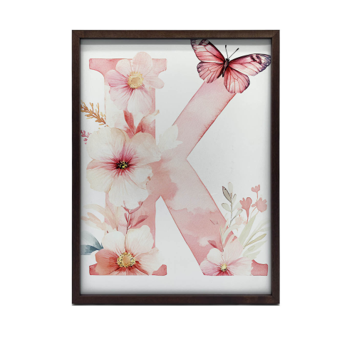K betűs virágos falikép gyerekszobába - 50x70 cm 🌸 Vidám és egyedi dekoráció a kicsik szobájába! Ez a gyönyörű falikép egy nagy K betűt ábrázol, amit gyönyörű virágok és egy pillangó díszít. Tökéletes választás, ha egyedi és stílusos dekorációval sze...