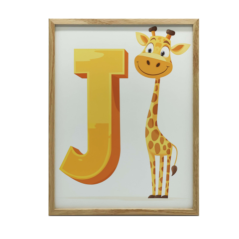 Vidám Zsiráf J betűs Vászonkép: Dekoráció gyerekszobába 🦒 Ez a 70x100 cm-es vászonkép egy mosolygós zsiráfot és egy nagy J betűt ábrázol, tökéletes választás gyerekszobák díszítéséhez. A kép Marcin Zbijowski helyi művész alkotása, prémium minőségű v...