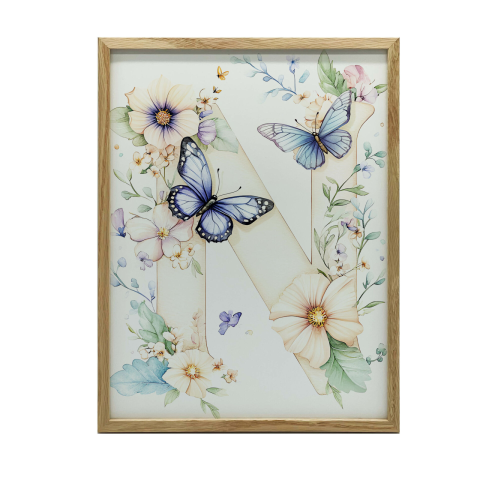Virágos N betűs vászonkép pillangókkal - 50x70 cm Ez a gyönyörű vászonkép egyedi dekorációja lehet otthonának. A képen egy nagy N betű látható, melyet gyönyörű virágok és pillangók díszítenek. A képet Marcin Zbijowski lengyel művész tervezte. Főbb j...