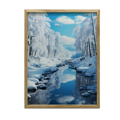 Téli táj vászonkép: Hangulatos dekoráció otthonába ❄️ Ezzel a gyönyörű, 50x70 cm-es vászonképpel varázslatos téli hangulatot varázsolhat otthonába. A prémium minőségű vászonra nyomtatott kép élethűen ábrázolja a havas tájat, a csendes folyót és a hófö...