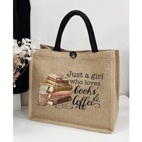 Táska mérete: 35 x 30 x 10 cm Gomb a táska zárására. Könyvek és kávé minta. Csak egy lány aki szereti a könyveket és a kávét felirat. Vászon kézitáska - Könyvek és kávé