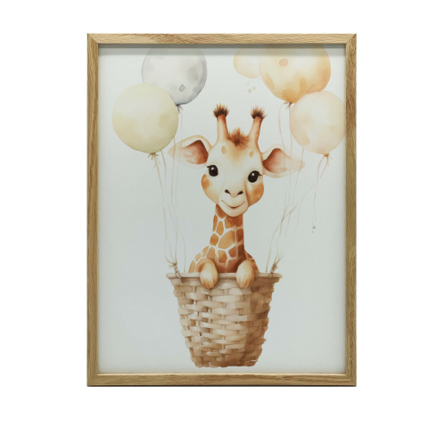 Vidám Zsiráf Lufiban - Gyerek Szoba Poszter (50x70 cm) 🦒🎈 Ez a bájos, 50x70 cm-es vászonkép egy vidám zsiráfot ábrázol, aki lufikkal repül az égen. Tökéletes választás gyerekszobákba, hogy vidámságot és egyedi hangulatot teremtsen. A prémium minősé...