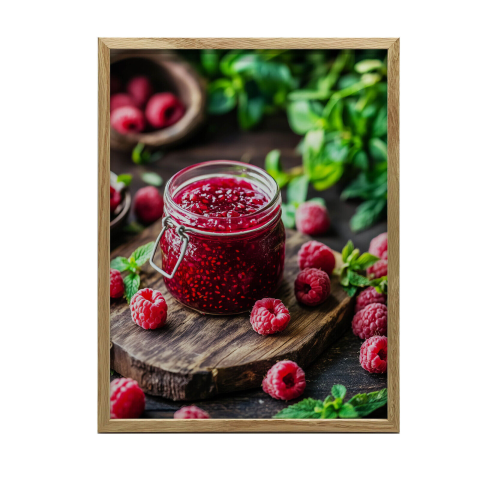 Málna lekvár festmény - 50x70 cm-es vászonkép, sötét fa kerettel Ez a gyönyörű 50x70 cm-es vászonkép egy üveg finom málna lekvárral és friss málnákkal ábrázol egy ínycsiklandó kompozíciót. A sötét fa keret elegáns megjelenést kölcsönöz a képnek, amely...