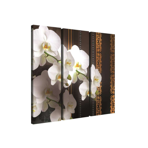 Elegáns Orchidea Vászonkép szett - 3 részes, 80x90 cm Díszítse otthonát ezzel a gyönyörű, 3 részes vászonképpel, melynek fő motívuma a fehér orchidea. A sötét háttér és az arany díszítés elegáns megjelenést kölcsönöz a képnek, tökéletesen illeszkedve...