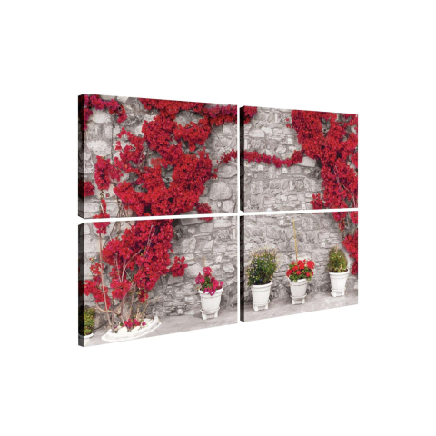 4 részes vászonkép szett - Élénkpiros virágok a faladon 🌺 Díszítsd otthonod falát ezzel a lenyűgöző, 4 részes vászonképpel, mely élénkpiros virágokat ábrázol egy kőfalon. A képek modern és elegáns megjelenést kölcsönöznek bármely helyiségnek. A csom...